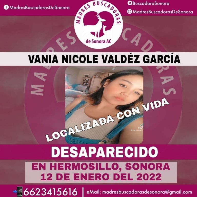 Hermosillo, Sonora.- Familiares de Vania Nicole Valdez García la reportaron como desaparecida en Hermosillo, Sonora, pero por fortuna ayer viernes 14 de enero se pudo conocer que la joven fue localizada sana y salva.
