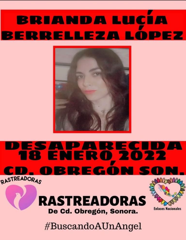 Ciudad Obregón, Sonora.- La noche de este miércoles, el colectivo Rastreadoras de Ciudad Obregón reportó la desaparición de la joven Brianda Lucía Berrelleza López en Ciudad Obregón y solicitó la ayuda la comunidad para encontrarla.