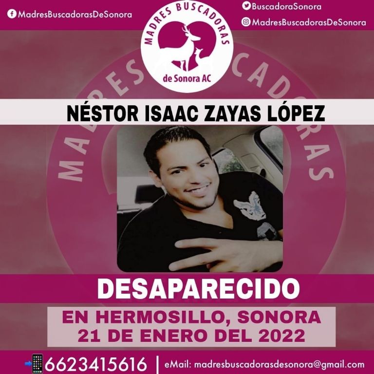 Hermosillo, Sonora.- El colectivo Madres Buscadoras de Sonora solicita la ayuda de la ciudadanía para encontrar a Néstor Isaac Zayas López, quien se encuentra en calidad de desaparecido desde hace varios días en Hermosillo, Sonora.