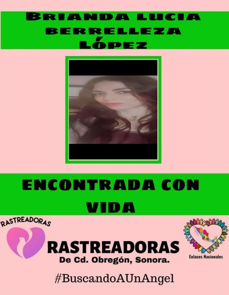 Ciudad Obregón, Sonora.- El colectivo Rastreadoras de Ciudad Obregón reveló este martes que la joven Brianda Lucía Berrelleza López fue encontrada con vida, luego de que sus familiares reportaran su desaparición en Ciudad Obregón, Sonora.