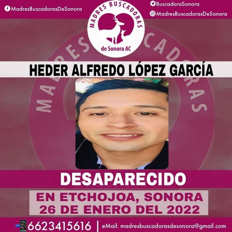 Etchojoa, Sonora.- El colectivo Madres Buscadoras de Sonora informó este fin de semana sobre la lamentable desaparición de Heder Alfredo López García, de quien no se sabe nada desde hace varios días en el municipio de Etchojoa, Sonora.