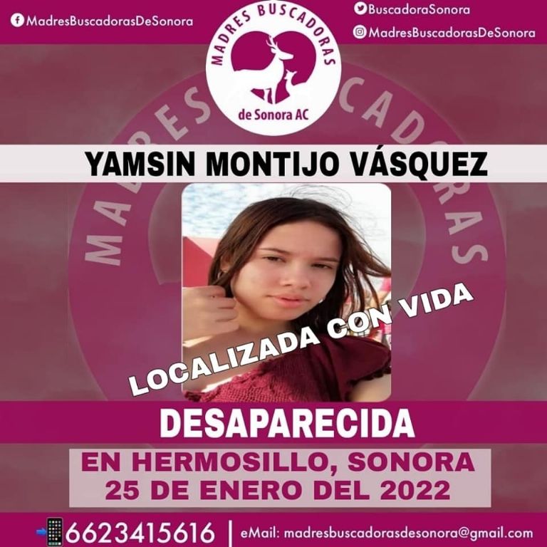 Hermosillo, Sonora.- El colectivo Madres Buscadoras de Sonora informó que Yasmín Montijo Vásquez fue encontrada con vida, luego de que su familia la reportara como desaparecida en Hermosillo, Sonora.