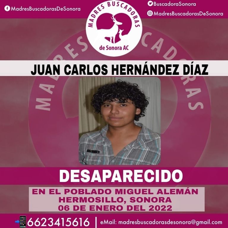 A través de redes sociales, el grupo de rastreadoras detalló que se trata del joven Juan Carlos Hernández Díaz, quien se encuentra extraviado en el poblado Miguel Alemán, municipio de Hermosillo, desde el día jueves 6 de enero de 2022.