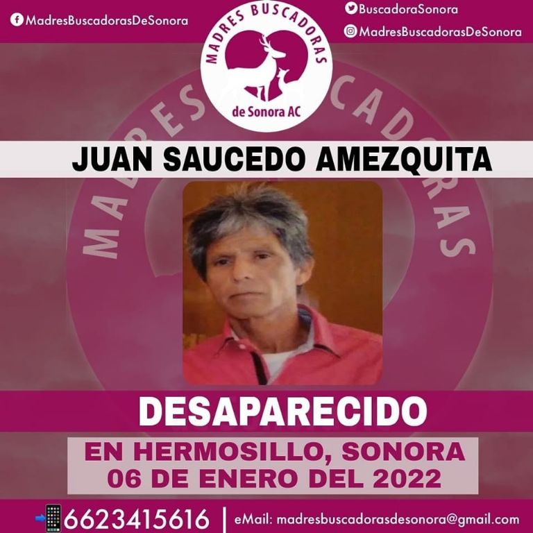 Hermosillo, Sonora.- El colectivo Madres Buscadoras de Sonora reveló este sábado que una familia sufre la ausencia de Juan Saucedo Amezquita, hombre que se encuentra en calidad de desaparecido en Hermosillo, Sonora.