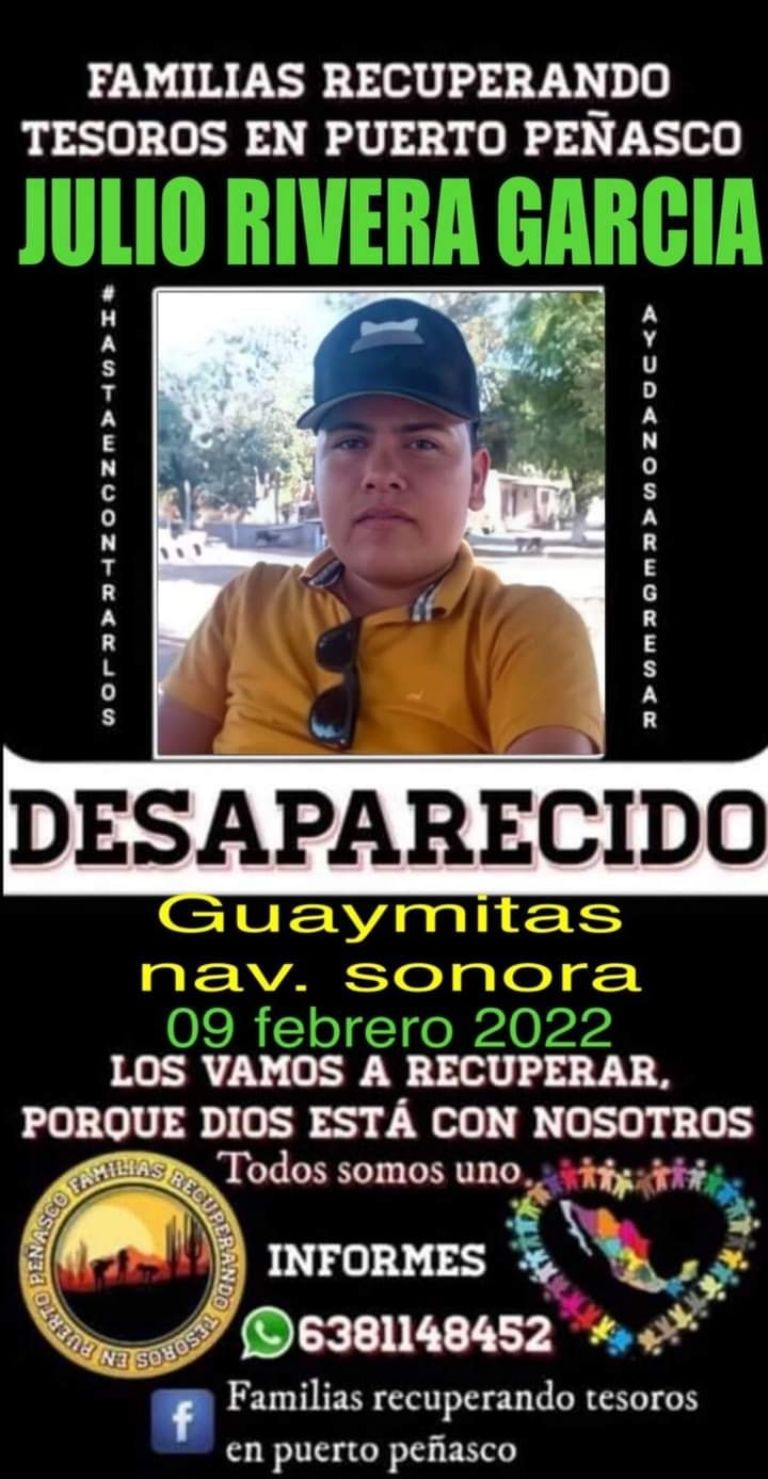 Navojoa, Sonora.- El colectivo Familias Recuperando Tesoros en Puerto Peñasco reportó la desaparición de Julio Rivera García, joven de quien nada sabe desde hace varias horas en la ciudad de Navojoa, Sonora.