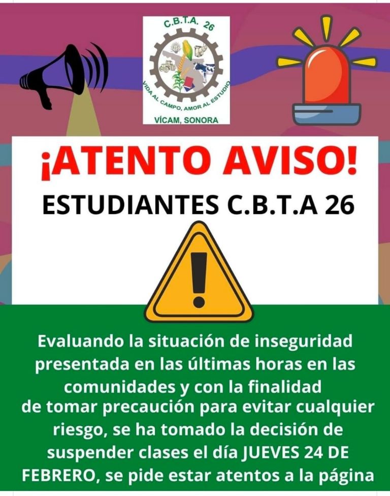 Ante ello, la población ha decidido "encerrarse" por el miedo de que haya nuevos enfrentamientos. Se han suspendido clases en los diferentes niveles educativos, tal es el caso del Centro de Bachillerato Tecnológico Agropecuario (CBTA) Número 26 el cual publicó el siguiente comunicado: