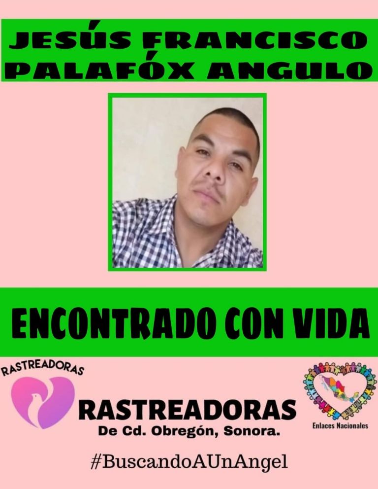 Ciudad Obregón, Sonora.- El colectivo Rastreadoras de Ciudad Obregón reveló que Jesús Francisco Palafox Angulo fue localizado con vida, luego de que fuera reportado como desaparecido desde el pasado mes de enero, en Ciudad Obregón, Sonora.