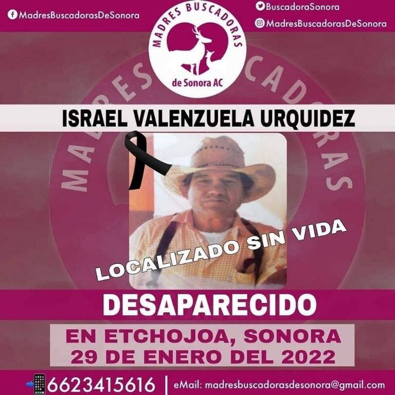 Etchojoa, Sonora.- El colectivo Madres Buscadoras de Sonora confirmó que Israel Valenzuela Urquídez fue localizado sin vida, luego de que fuera reportado como desaparecido desde el pasado mes de enero, en el municipio de Etchojoa, Sonora.