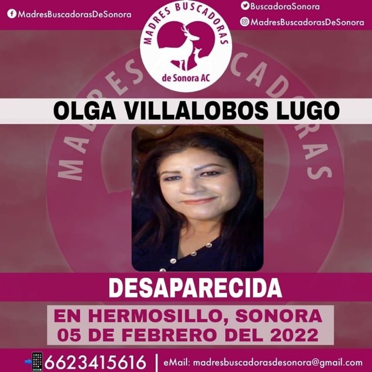 Por su parte, el colectivo Madres Buscadoras de Sonora difundió la ficha de búsqueda de Olga Villalobos y puso a disposición su número 662 341 5616 para que la gente llame y aporte cualquier dato que ayude a dar con su ubicación.