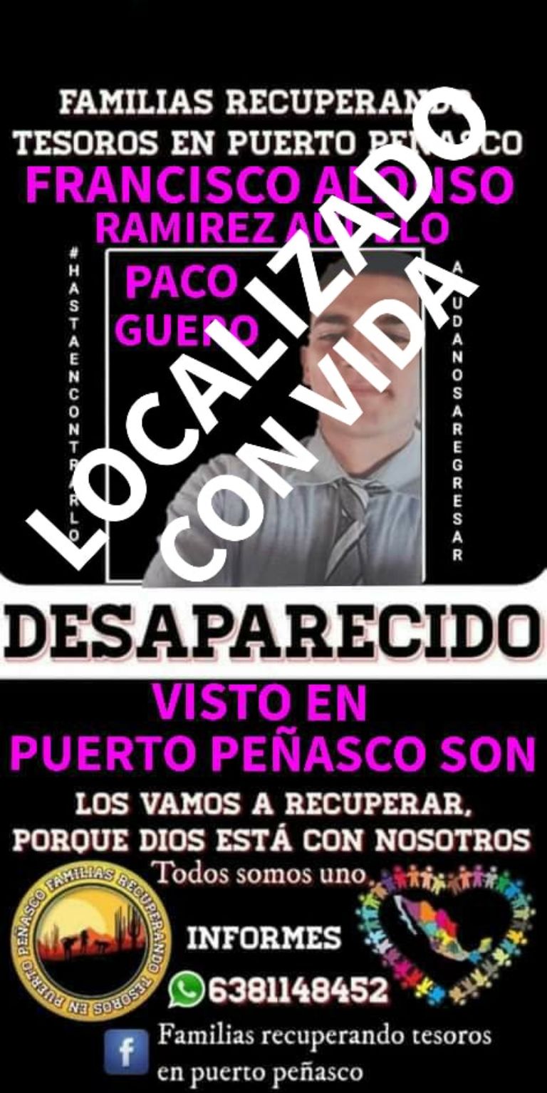 Puerto Peñasco, Sonora.- Francisco Alonso Ramírez Audelo se encontraba en calidad de desaparecido en Puerto Peñasco, pero por fortuna fue localizado con vida, así lo confirmó el colectivo Familias Recuperando Tesoros en Puerto Peñasco.