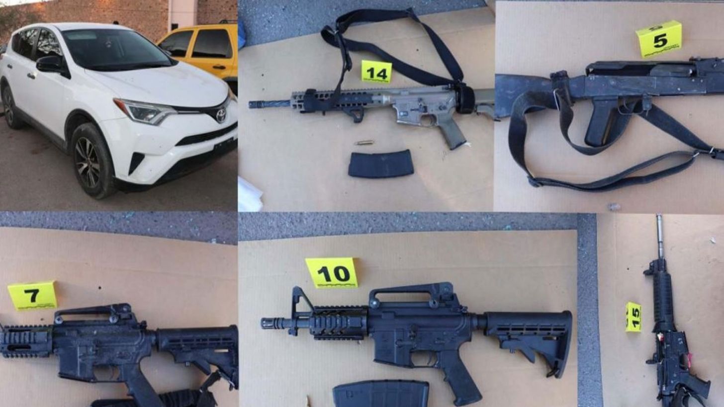 Asimismo, en el lugar fueron procesadas cinco armas largas: una calibre 7.62×39, tres del calibre 5.56×45 y una .223, todas abastecidas con tiros útiles, doce cargadores abastecidos de los mismos calibres que las armas y uno vacío para arma corta calibre .45, así como diversos casquillos percutidos.