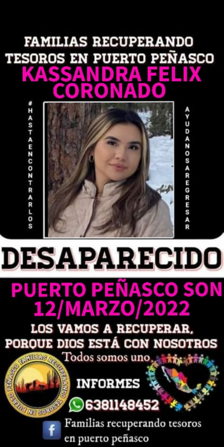 Como se informó en su momento, Kassandra había sido vista por última vez en un bar de Puerto Peñasco, luego de que el sábado 12 de marzo de 2022 saliera de su vivienda acompañada de su prima y ya no regresara.