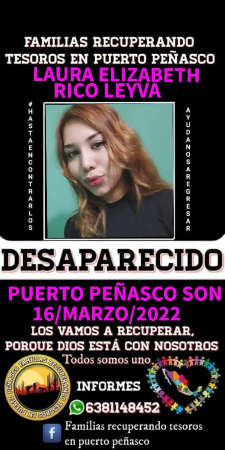 Por su parte, el grupo Familias Recuperado Tesoros en Puerto Peñasco difundió la ficha de búsqueda de Laura Elizabeth y puso a disposición su número 638 114 8452 para que la gente aporte información que ayude a dar con su ubicación.