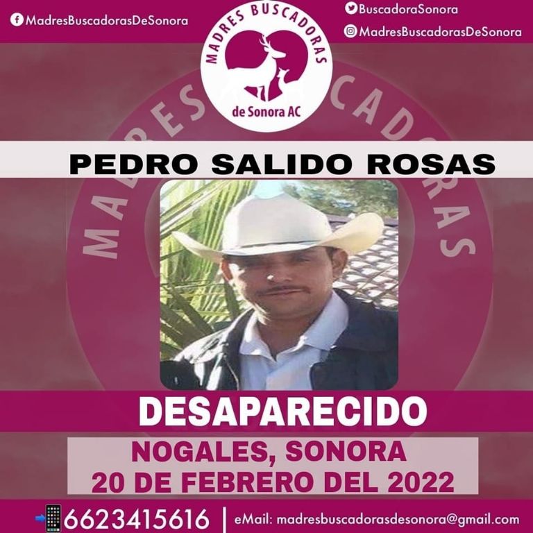 Por su parte, el grupo Madres Buscadoras de Sonora difundió la ficha de búsqueda de Pedro y puso a disposición su número 662 341 5616 para que la gente llame y aporte cualquier dato que ayude a dar con su ubicación.