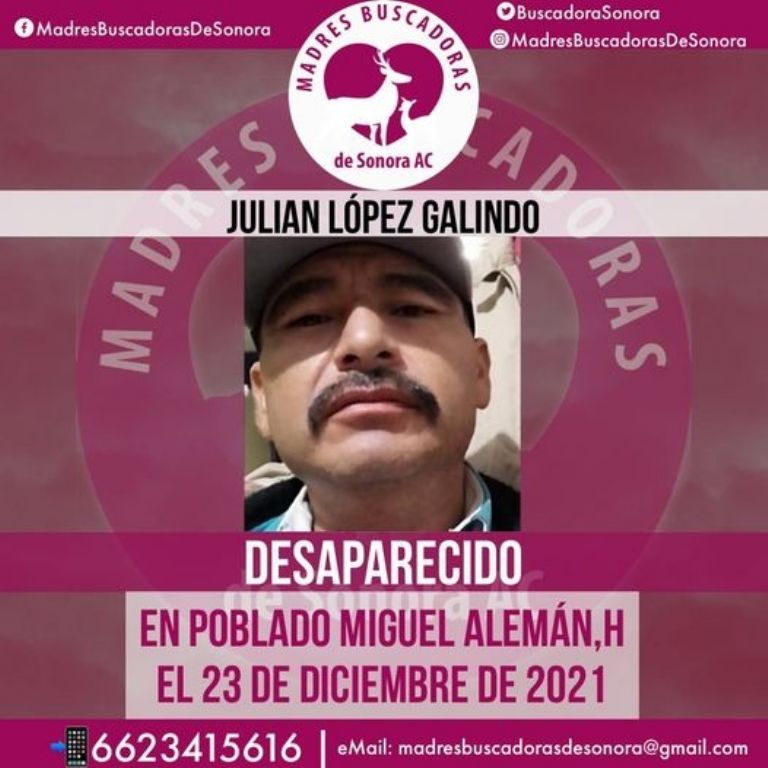 Miguel Alemán, Sonora.- El colectivo Madres Buscadoras de Sonora informó sobre la lamentable desaparición de Julián López Galindo, de quien nada se ha sabido desde antes de Navidad y piden la ayuda de las personas para dar con su ubicación.