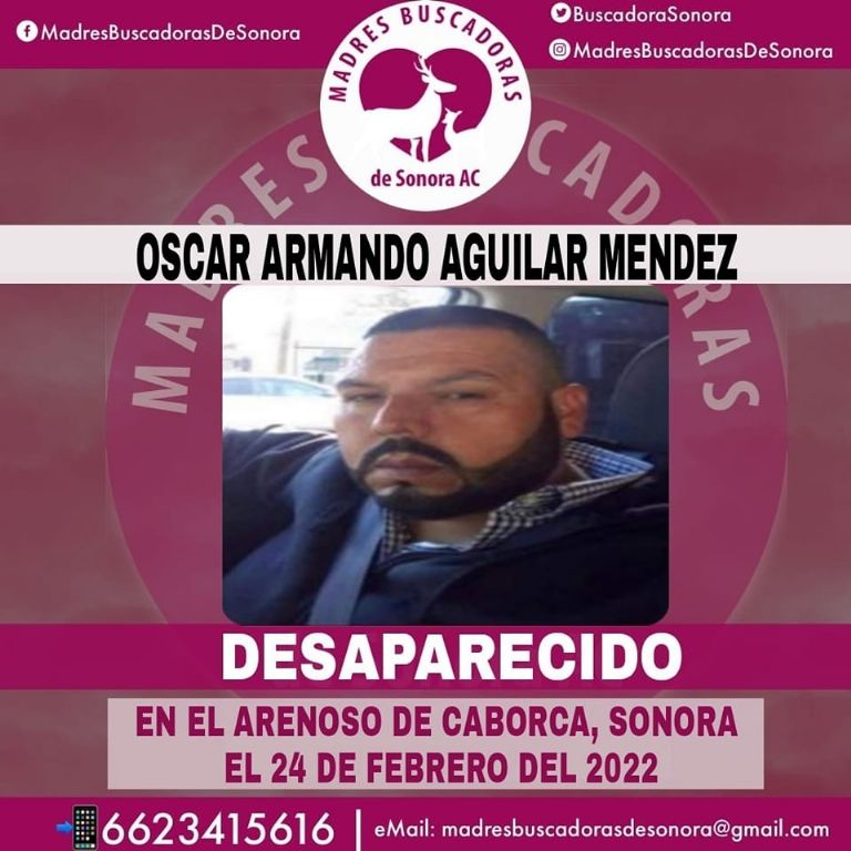 Altar, Sonora.- El colectivo Madres Buscadoras de Sonora pide la ayuda de la comunidad para localizar al señor Óscar Armado Aguilar Méndez, quien se encuentra desaparecido desde el pasado mes de febrero en el municipio de Altar, Sonora.