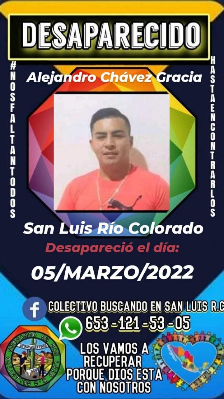 San Luis Río Colorado, Sonora.- Este miércoles, el colectivo Buscando en San Luis R. C. reportó la desaparición de Alejandro Chávez Gracia, joven que se encuentra desaparecido desde hace varios días en San Luis Río Colorado, Sonora.
