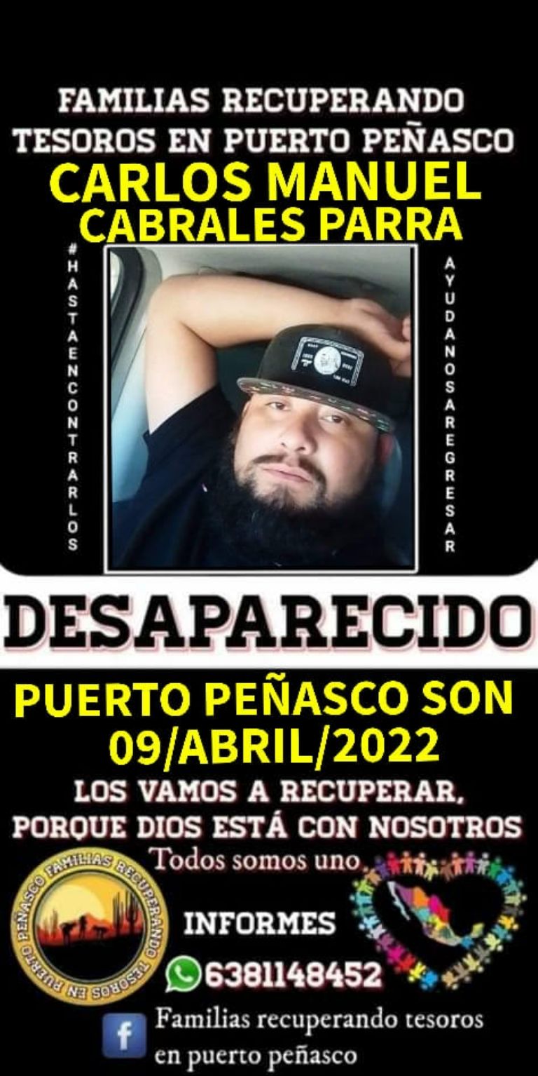 Puerto Peñasco, Sonora.- El colectivo Familias Recuperando Tesoros en Puerto Peñasco pide la ayuda de la comunidad sonorense para encontrar a Carlos Manuel Cabrales Parra, quien desapareció hace varias horas en su natal Puerto Peñasco, Sonora.