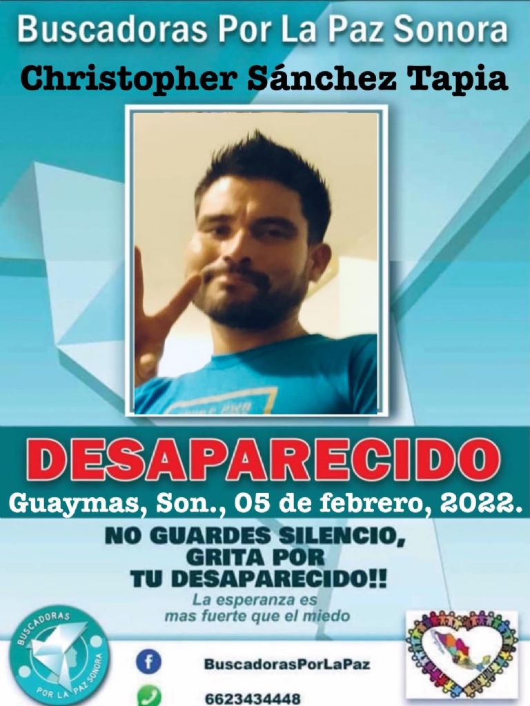 Guaymas, Sonora.- El colectivo Buscadoras por la Paz pide la ayuda de la ciudadanía para localizar a Christopher Sánchez Tapia, vecino de Guaymas, Sonora, quien se encuentra en calidad de desaparecido desde hace más de un mes.