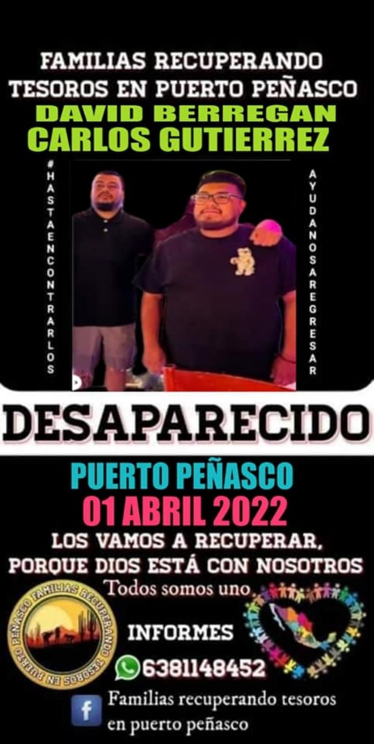 Por su parte, el colectivo Familias Recuperando Tesoros en Puerto Peñasco difundió la ficha de búsqueda de David y Carlos y puso disposición su teléfono 638 114 8452 para que la gente llame y aporte cualquier información que ayude a dar con ellos.