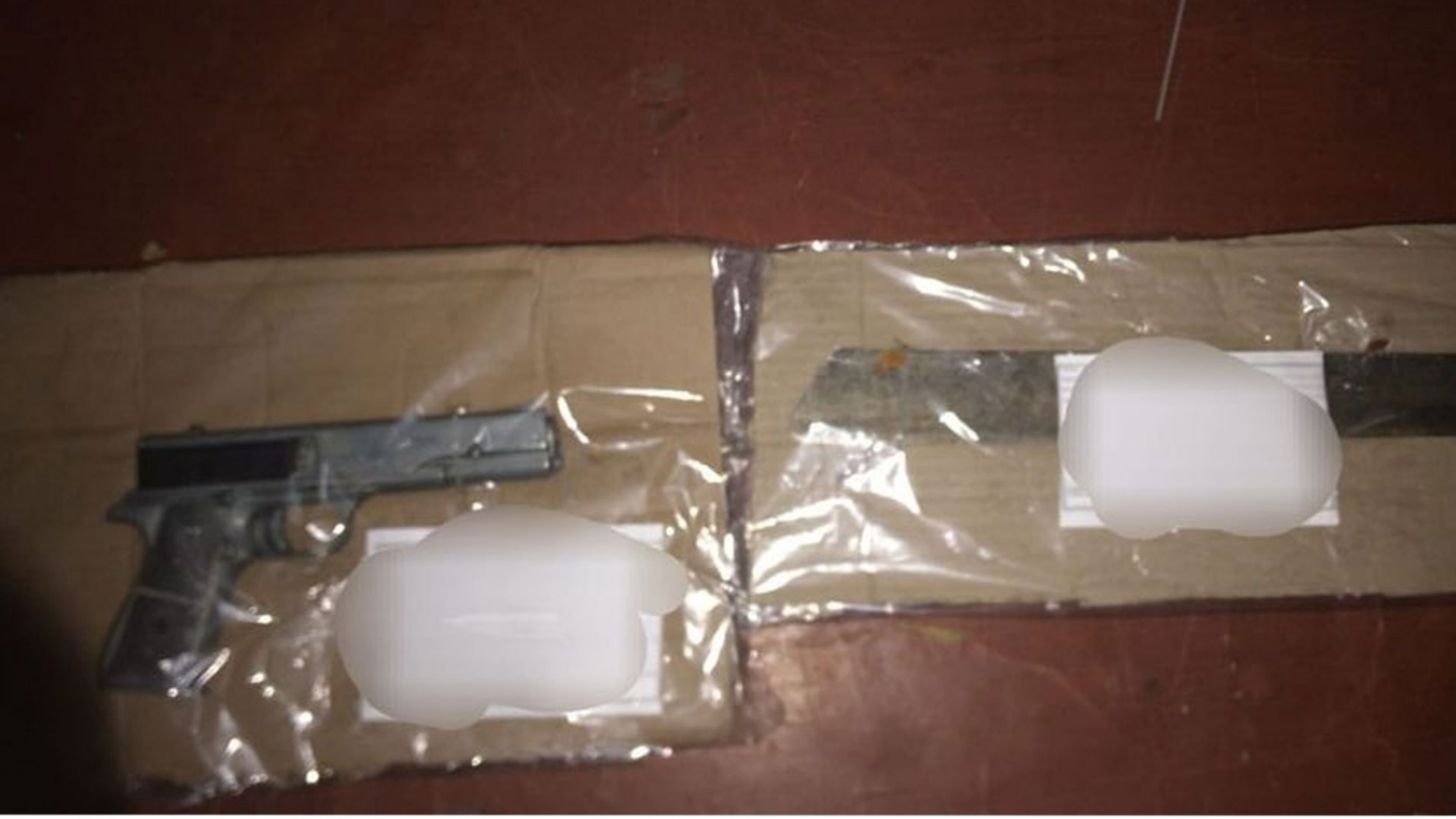 Al inspeccionarlo, le encontraron un arma blanca tipo machete, de aproximadamente 50 centímetros y una réplica de arma de fuego. Tanto el sujeto como las armas fueron presentados ante el Ministerio Público correspondiente.