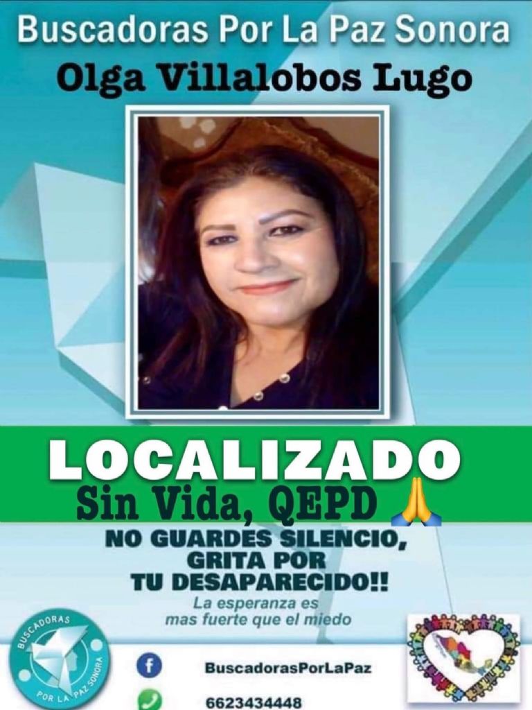 Buscadoras Por la Paz se une a la pena que embarga a familiares y amigos de la señora Olga Villalobos, desafortunadamente fue localizada sin vida. Elevamos nuestras oraciones por su eterno descanso, Dios les dé pronta resignación", se lee en Facebook.
