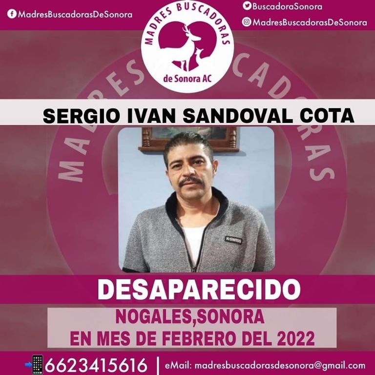 Estamos buscando a mi hijo, se llama Sergio Iván Sandoval Cota. Él se fue a Nogales hace un mes y desde entonces no se ha comunicado con su familia ni amigos... de favor les pido que si lo han visto o saben algo de él se pueden comunicar directamente conmigo", escribió la señora en Facebook.
