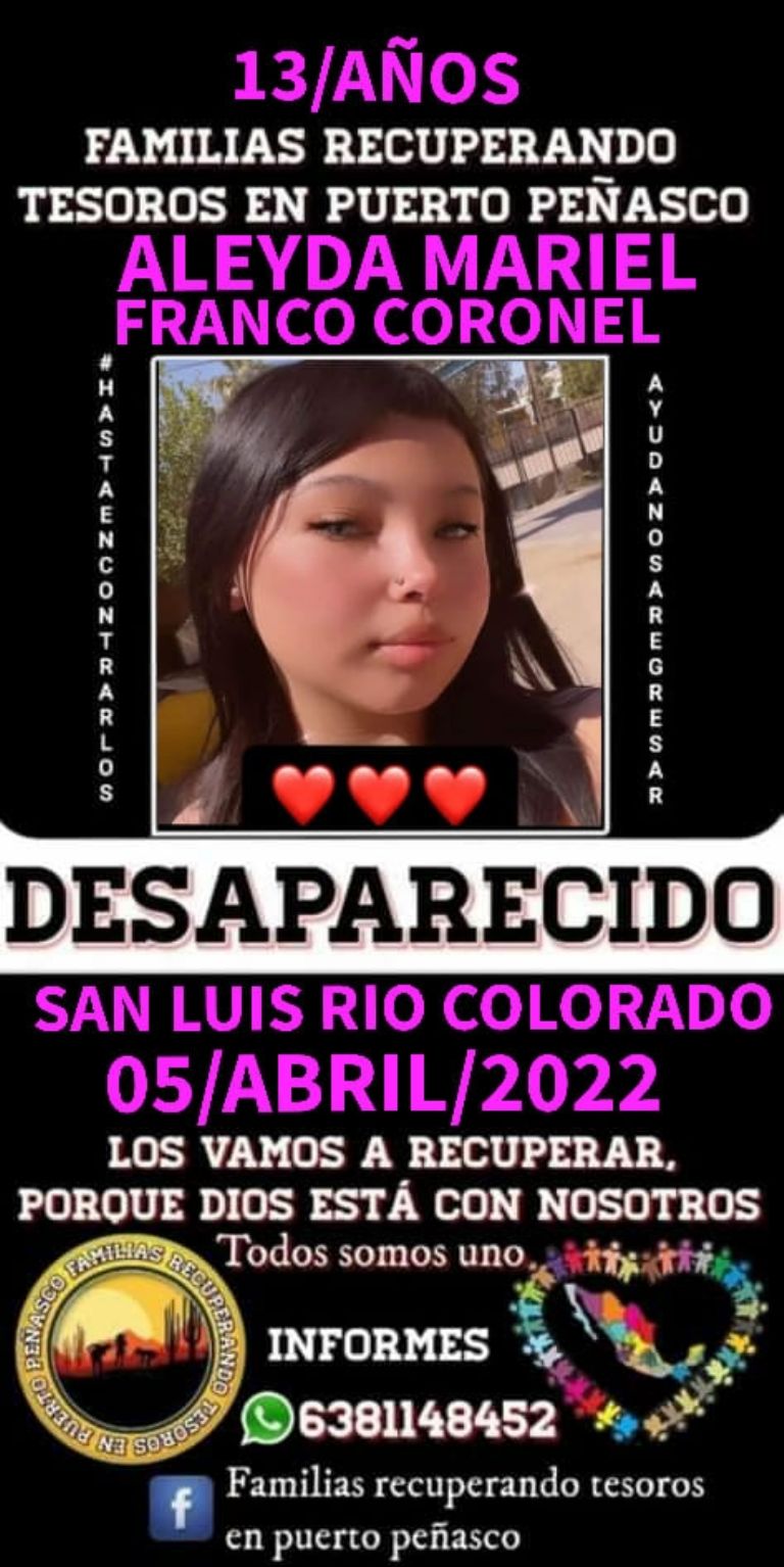 Por su parte, el colectivo Familias Recuperando Tesoros en Puerto Peñasco publicó la ficha de búsqueda y puso a disposición su número 638 114 8452 para aportar datos que ayuden a dar con su paradero.