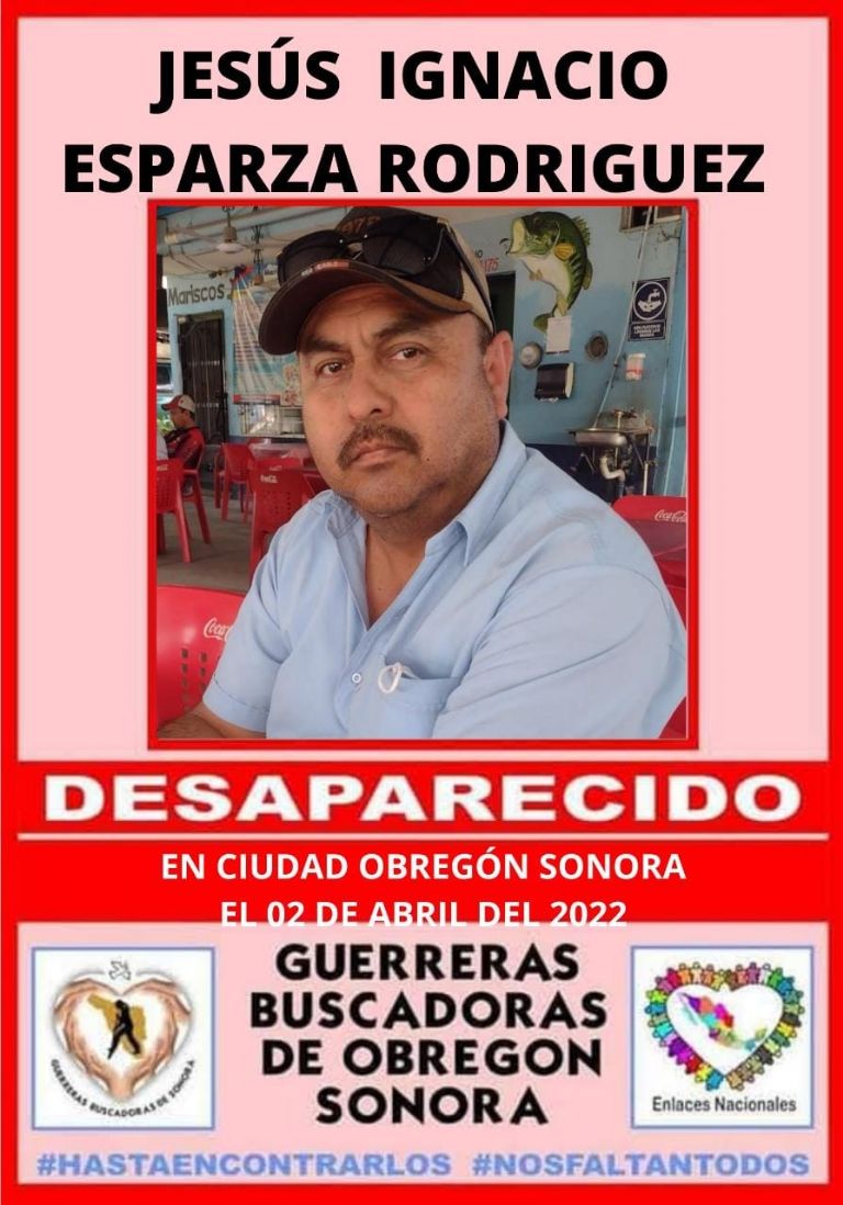 Ciudad Obregón, Sonora.- El colectivo Guerreras Buscadoras de Sonora informó este miércoles 6 de abril que el señor Jesús Ignacio Esparza Rodríguez, residente de Ciudad Obregón, se encuentra en calidad de desaparecido desde la semana pasada.