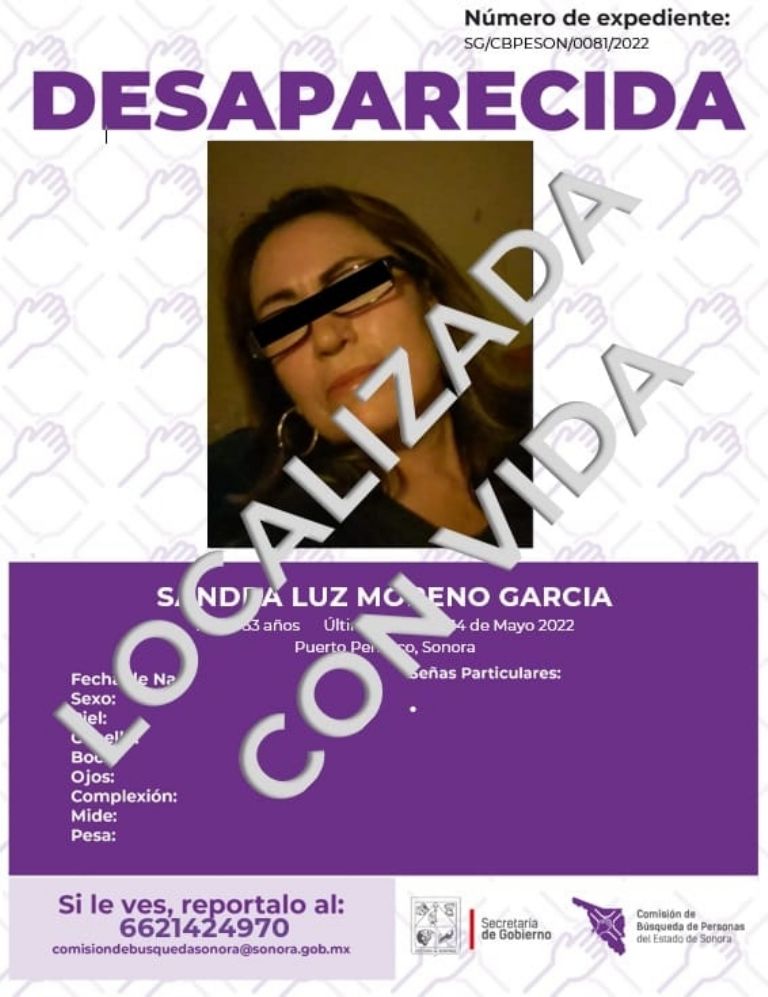Puerto Peñasco, Sonora.- Este lunes se confirmó que Sandra Luz Moreno García fue localizado con vida, luego de que hace unos días su familia la reportara como desaparecido en su natal Puerto Peñasco, Sonora.