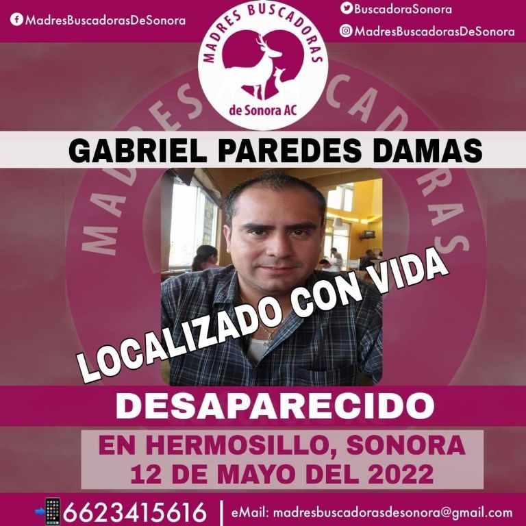Así lo reveló el colectivo de mujeres Madres Buscadoras de Sonora, quien a través de sus redes sociales dio la buena noticia de que el hombre extraviado se encuentra sano y salvo y fuera de cualquier peligro.
