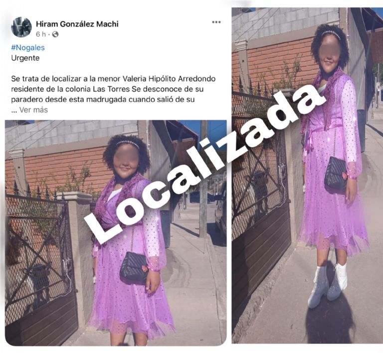 Por su parte, Valeria Hipólito fue encontrada bien de salud ayer miércoles en Nogales, luego de que comenzara a circular en redes sociales su fotografía, donde su familia pedía el apoyo de la ciudadanía para dar con su paradero, pues tenía horas sin saber nada de ella.