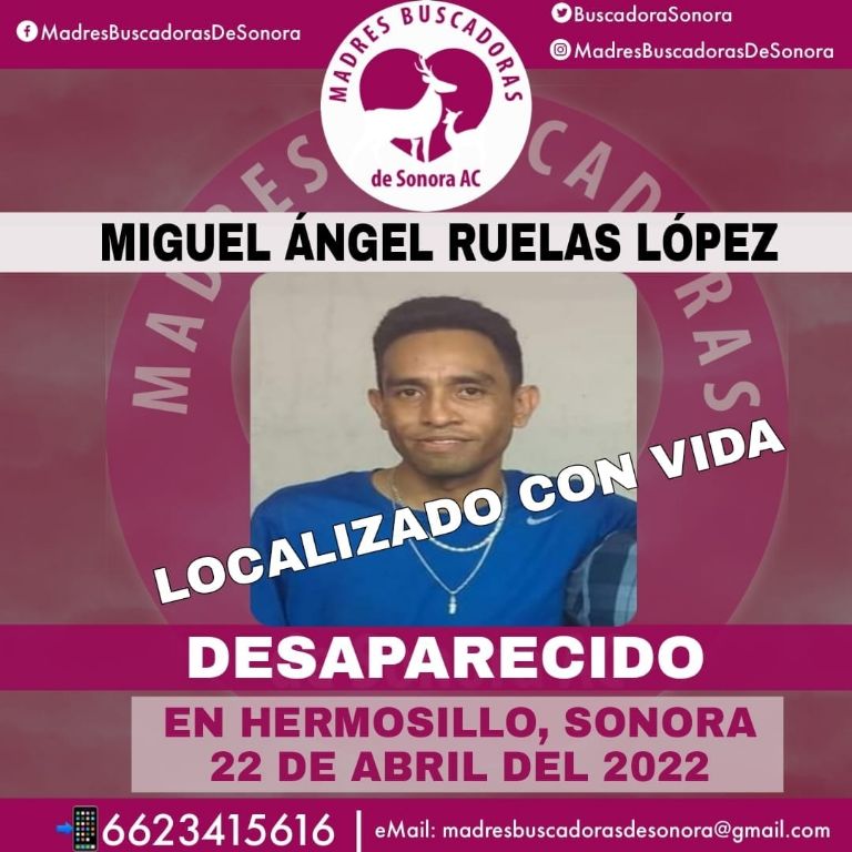 Hermosillo, Sonora.- El colectivo Madres Buscadoras de Sonora informó que se logró la localización de Miguel Ángel Ruelas López, vecino de Hermosillo que se encontraba en calidad de desaparecido desde el pasado mes de abril.