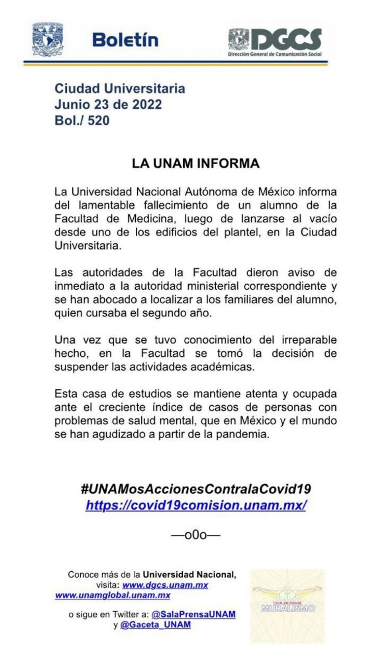 Por tal motivo, la Facultad decidió suspender las actividades académicas: "Esta casa de estudios se mantiene atenta y ocupada ante el creciente índice de casos de personas con problemas de salud mental, que en México y el mundo se han agudizado a partir de la pandemia", agregó la universidad en el comunicado. Las autoridades de la Facultad notificaron inmediatamente a la autoridad ministerial correspondientes y están tratando de localizar a los familiares del alumno; la zona fue acordonada para permitir las labores de los servicios de emergencias.
