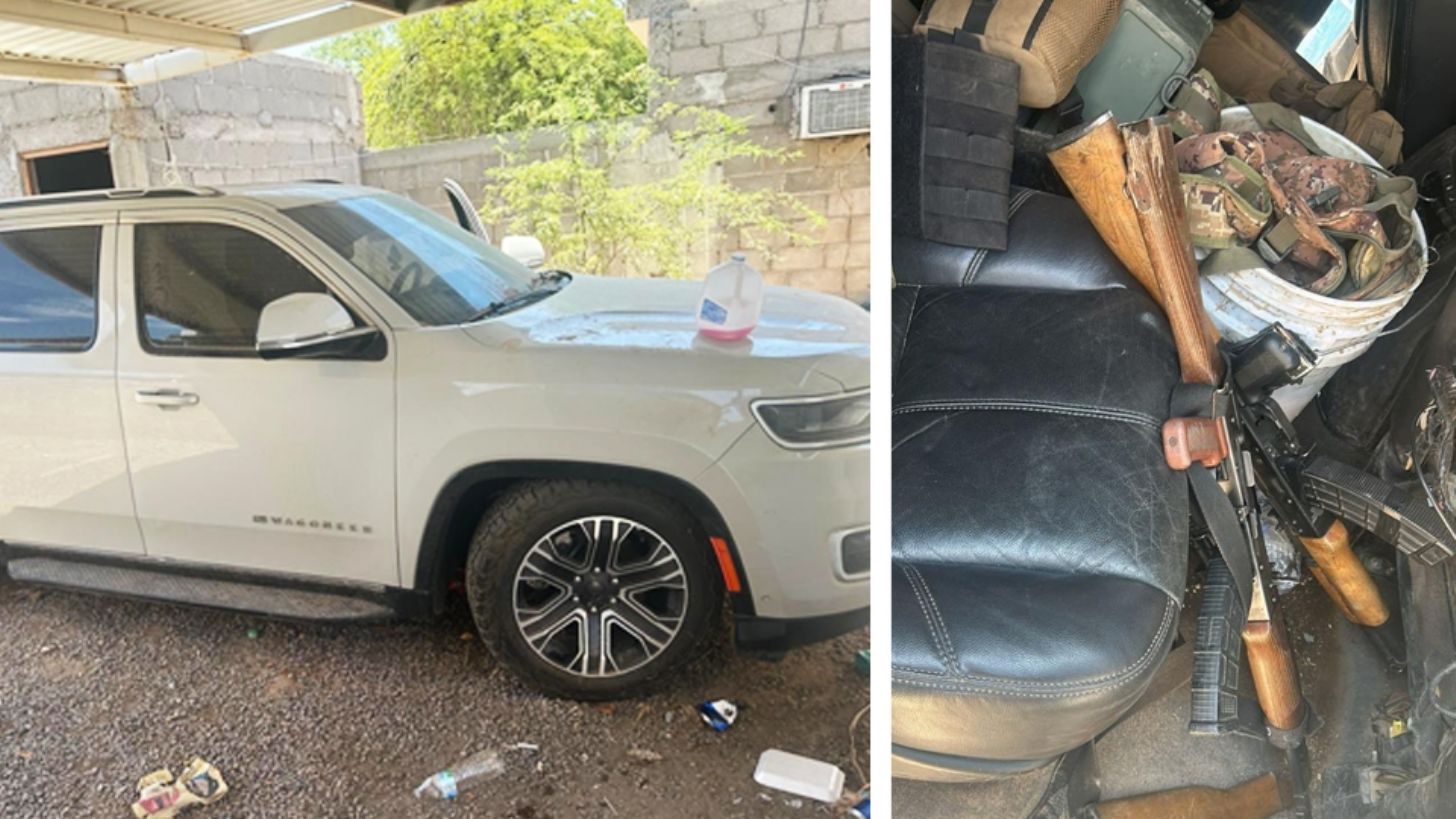 La dependencia de seguridad detalló que personal de Servicios Periciales, la Agencia Ministerial de Investigación Criminal (AMIC), la Secretaría de la Defensa Nacional (Sedena) y la Guardia Nacional (GN), realizaron el operativo este domingo 21 de julio en un inmueble de la colonia San Diego. En el lugar se aseguraron un vehículo Jeep Wagoneer, modelo 2022, y un pick up Toyota Tacoma, modelo 2024, ambos con reporte de robo en Estados Unidos.