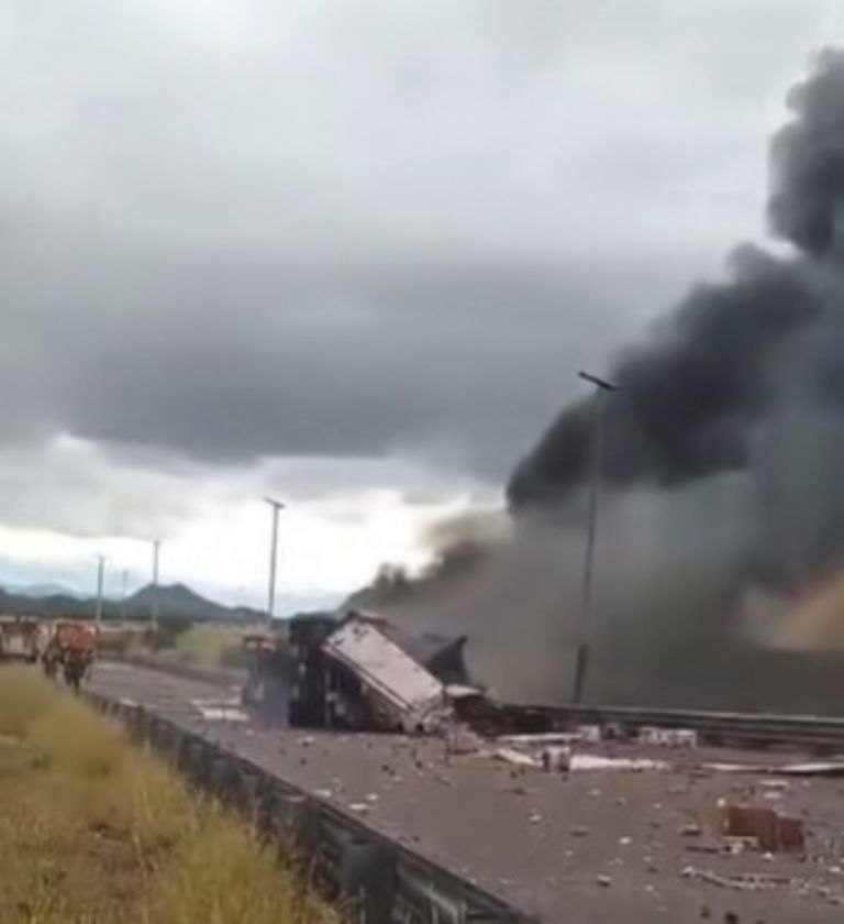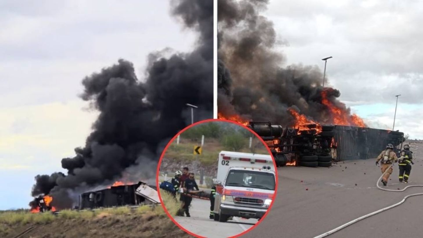 Hermosillo, Sonora.- La tarde de este domingo 12 de octubre de 2025 ocurrió un aparatoso accidente sobre la carretera Hermosillo–Guaymas, en donde se registró el volcamiento y posterior incendio de un tráiler que transportaba manzanas. Se indicó que el percance se registró en el kilómetro 237, bajando el libramiento, rumbo de norte a sur, dejando como saldo preliminar a una persona lesionada que tuvo que ser auxiliada por los cuerpos de rescate.