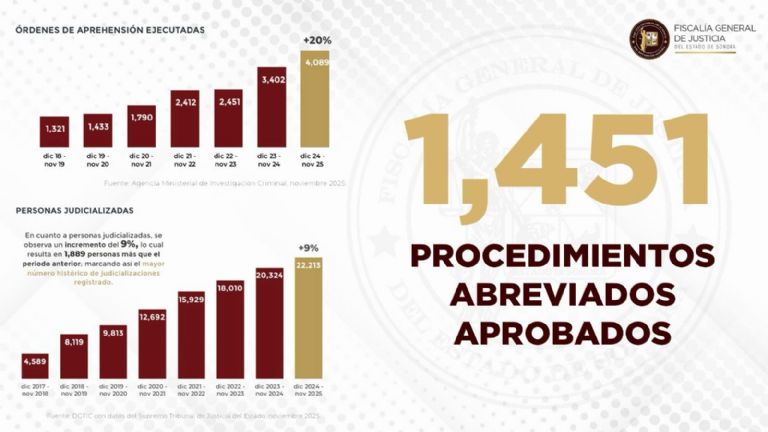 Hermosillo, Sonora.- En el informe anual de actividades correspondiente al ciclo 2025, la Fiscalía General de Justicia del Estado de Sonora (FGJES) reveló los resultados operativos obtenidos entre diciembre de 2024 y noviembre de 2025. El organismo destacó un incremento importante en la efectividad de sus procesos, destacando un aumento del 20 por ciento en la ejecución de órdenes de aprehensión en comparación con el periodo homólogo anterior (diciembre 2023 – noviembre 2024).