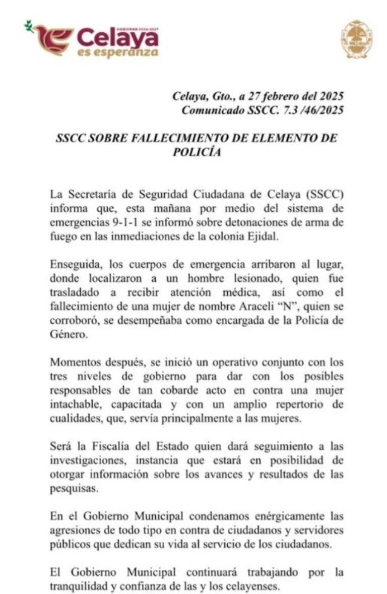 "Los cuerpos de emergencia arribaron al lugar, donde localizaron a un hombre lesionado, quien fue trasladado a recibir atención médica, así como el fallecimiento de una mujer de nombre Araceli 'N', quien se corroboró, se desempeñaba como encarga de la Policía de Género", forma parte de un fragmento compartido acerca de lo ocurrido por la Secretaría de Seguridad Ciudadana de Celaya (SSCC).