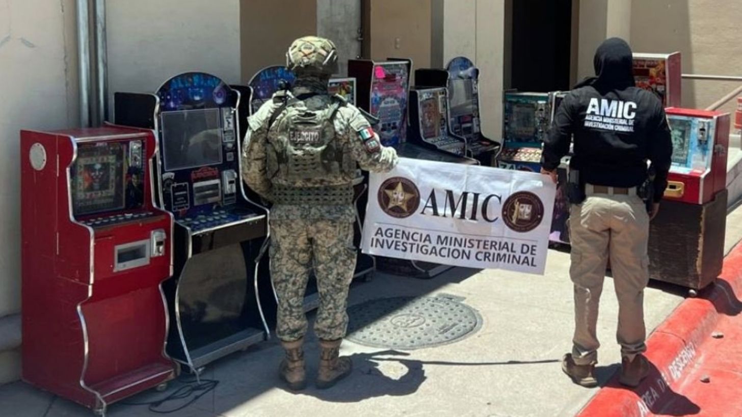 Ciudad Obregón, Sonora.- En seguimiento a una línea de investigación, elementos de la Agencia Ministerial de Investigación Criminal (AMIC) y efectivos de la Secretaría de la Defensa Nacional (Defensa) aseguraron 11 máquinas tragamonedas colocadas de forma irregular frente a establecimientos comerciales en Ciudad Obregón, según informó este martes la Fiscalía General de Justicia del Estado de Sonora (FGJES).