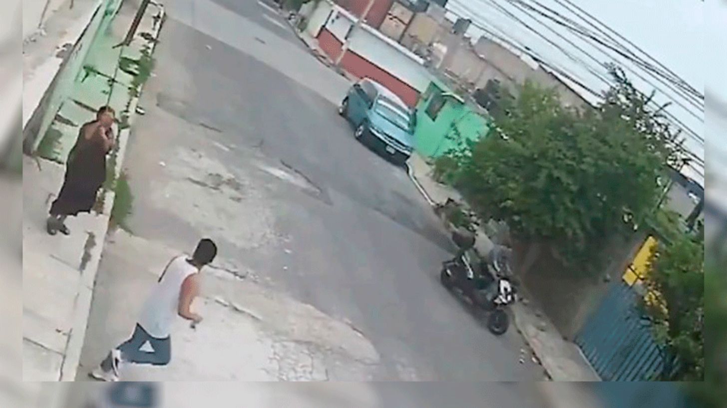Al inicio del video se ve al individuo, vestido con una playera sin mangas color blanco, acercarse con total confianza hacia el niño para intentar quitarle la patineta. El menor, angustiado pero decidido, se aferró con todas sus fuerzas para no dejarla ir. Aun así, por la evidente diferencia de fuerza, era casi seguro que el sujeto terminaría arrebatándole el objeto… hasta que apareció la heroína del pequeño.