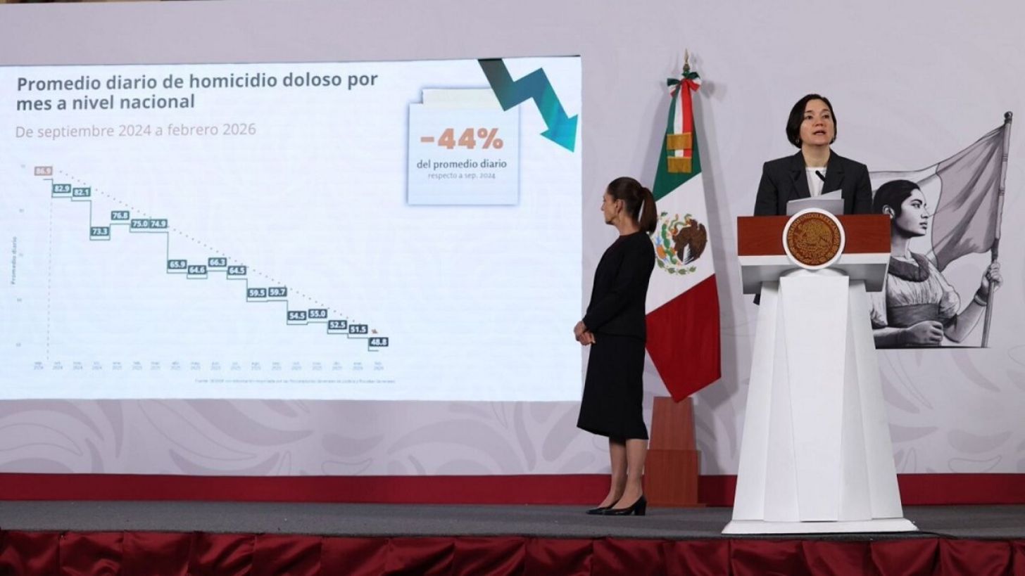 Posteriormente, la titular del Secretariado Ejecutivo del Sistema Nacional de Seguridad Pública (SESNSP), Marcela Figueroa, detalló que el promedio diario de asesinatos pasó de 86.9 casos en septiembre de 2024 a 48.8 en febrero de 2026. Esto significa una reducción de 38 homicidios diarios en ese periodo. La funcionaria subrayó que el registro de febrero de 2026 es el más bajo para ese mes desde 2016, cuando comenzaron a analizarse las estadísticas con esa referencia.