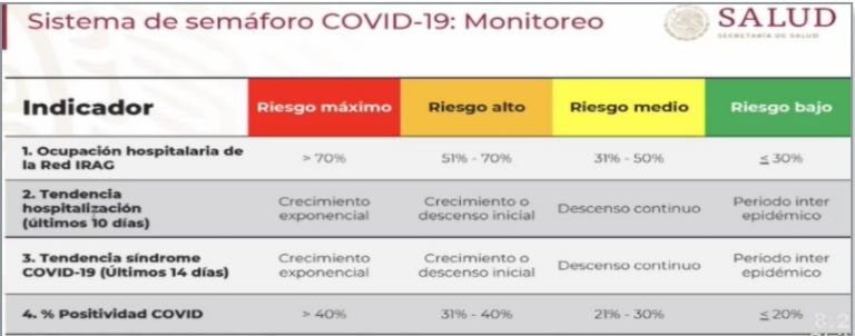 De acuerdo con la Secretaría de Salud citada por Milenio, el semáforo del Covid-19 consta de cuatro colores: rojo, naranja, amarillo y verde, que son determinados por cuatro parámetros acordados entre el gobierno federal y los gobiernos estatales.