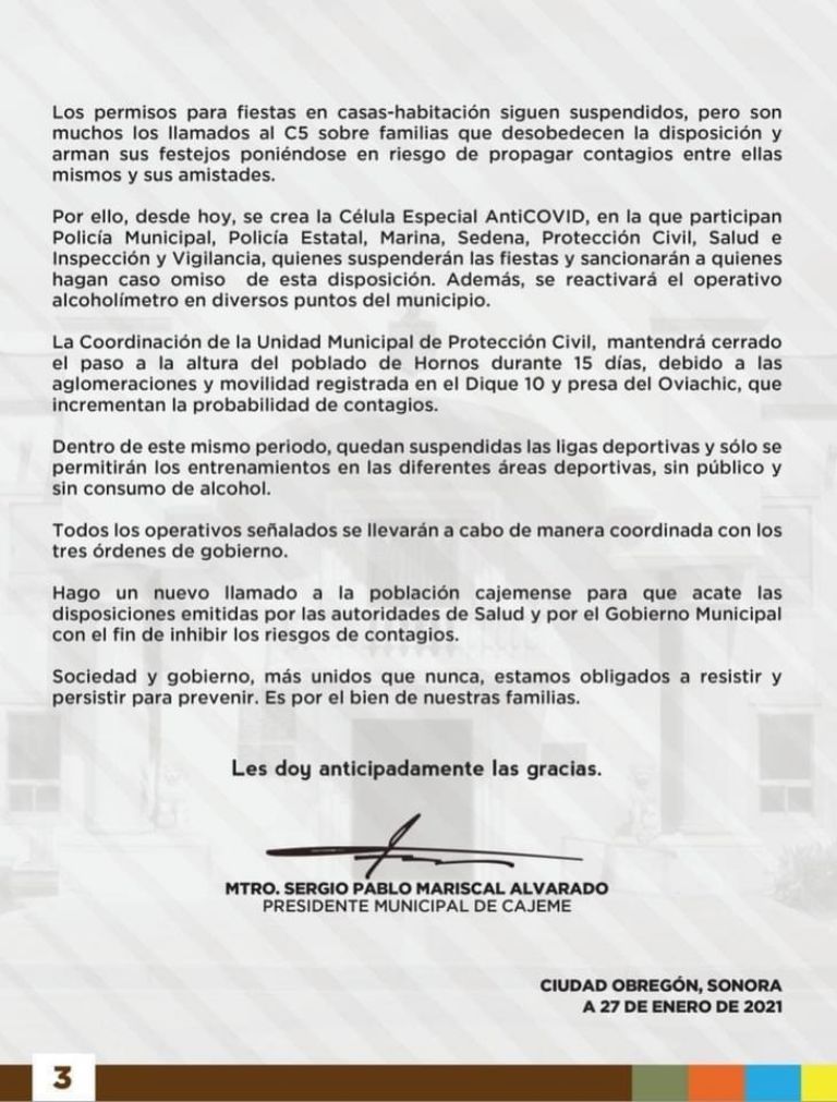 Ciudad Obregón, Sonora.- La mañana de este miércoles 27 de enero, el Ayuntamiento de Cajeme, encabezado por el alcalde Sergio Pablo Mariscal, decidió que a partir de hoy, toda actividad será suspendida a partir de las 20:00, toda vez que el municipio regresó al Semáforo Rojo del Covid-19.