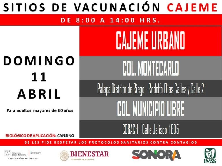 Sitios de vacunación: Colonia Montecarlo, Palapa Distrito de Riego – Rodolfo Elías Calles y Calle 2, colonia Municipio Libre, Cobach – Calle Jalisco #1605.