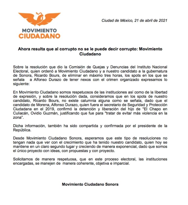 "En Movimiento Ciudadano somos respetuosos de las instituciones, así como de la libertad de expresión, y sobre la resolución dada, consideramos que en los spots de nuestro candidato, Ricardo Bours, no existe calumnia alguna como se señala, dado que el candidato de Morena, Alfonso Durazo, quien fuera el secretario de Seguridad y Protección Ciudadana en 2019, confirmó la detención y liberación del hijo de 'El Chapo' en Culiacán, Ovidio Guzmán, justificando que fue para 'tratar de evitar más violencia en la zona'".