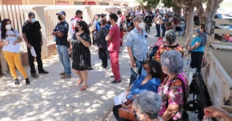 Ciudad Obregón, Sonora.- Adultos mayores nuevamente realizaron largas filas para recibir la vacuna contra el Covid-19 en Cajeme, una vez que arrancó el proceso de vacunación en las zonas rurales del municipio, provocando inconformidad y desesperación por parte de los presentes.