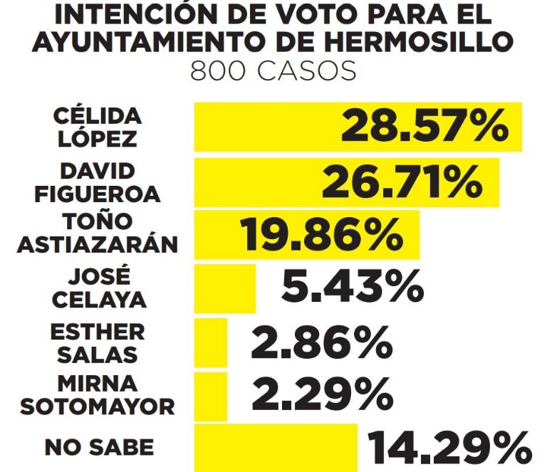 De acuerdo a una encuesta realizada por TRIBUNA Sonora 28. 6 por ciento de los hermosillenses votarían por la morenista, 26.7 por el candidato de Movimiento Ciudadano y Antonio Astiazaran queda estancado en el tercer sitio con 19 puntos porcentuales.