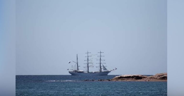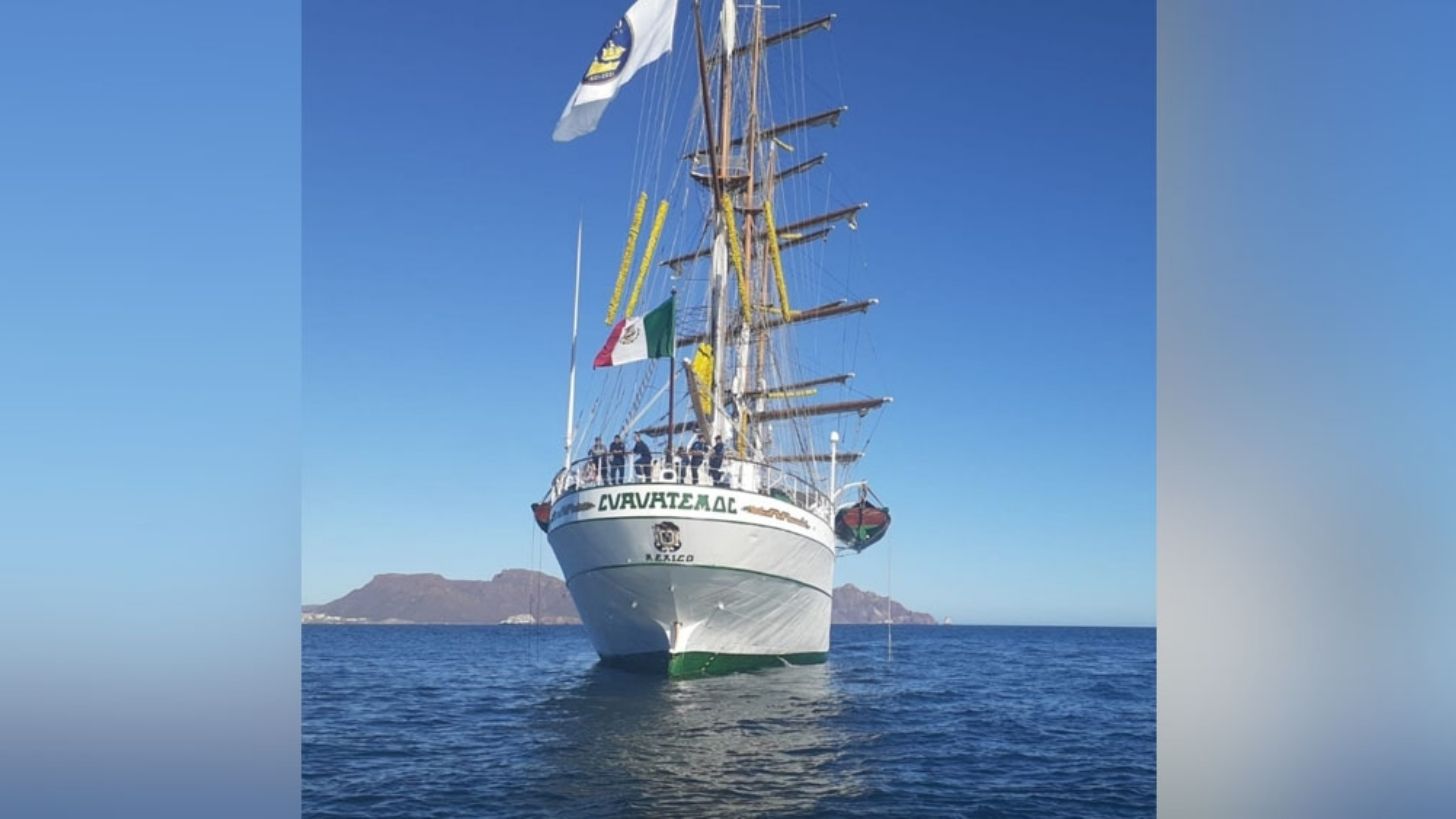 El horizonte hacia el Mar de Cortés, se vio interrumpido por la silueta del Buque Escuela Cuauhtémoc, de la Marina Nacional y que realiza un recorrido por los puertos mexicanos como parte del entrenamiento de los marinos en formación.