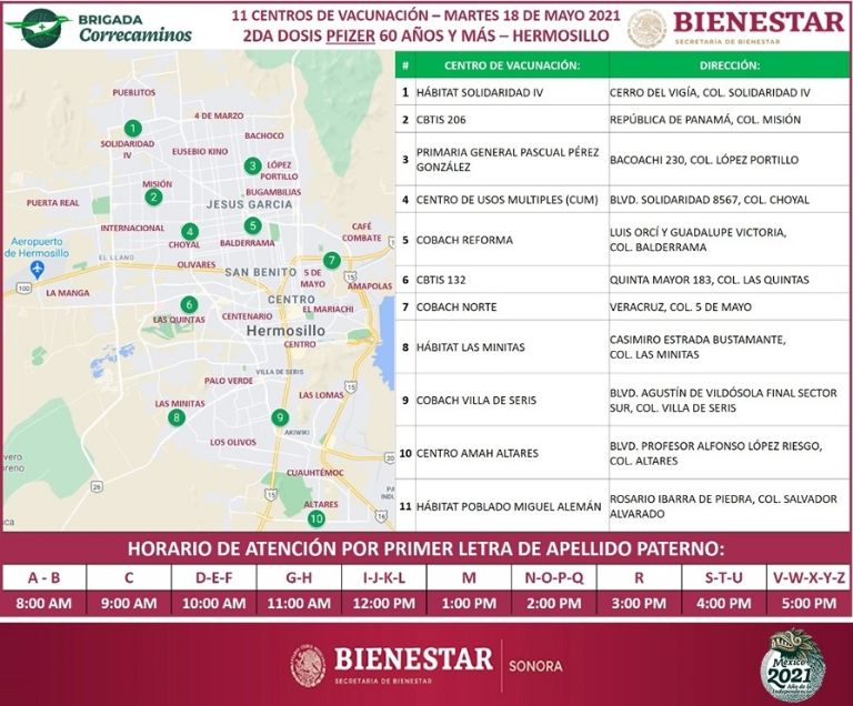 Serán once los puntos de aplicación y se ubicarán en los Centros Hábitat Solidaridad IV, Las Minitas y Poblado Miguel Alemán, así como en los CBTIS 206 y 132, la Primaria General Pascual Pérez González, el Centro Amah Altares, el Centro de Usos Múltiples (CUM), el Cobach Norte, Reforma y Villa de Seris.