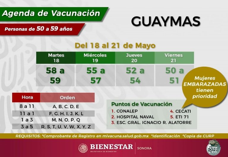 Guaymas, Sonora.- Como marcaba el Plan de Vacunación implementado por Bienestar en el estado de Sonora, el pasado martes 18 de mayo comenzó en Guaymas la aplicación del biológico contra Covid-19 en personas de entre 50 y 59 años, así como de mujeres embarazadas, sin embargo, hubo poca respuesta de la ciudadanía.